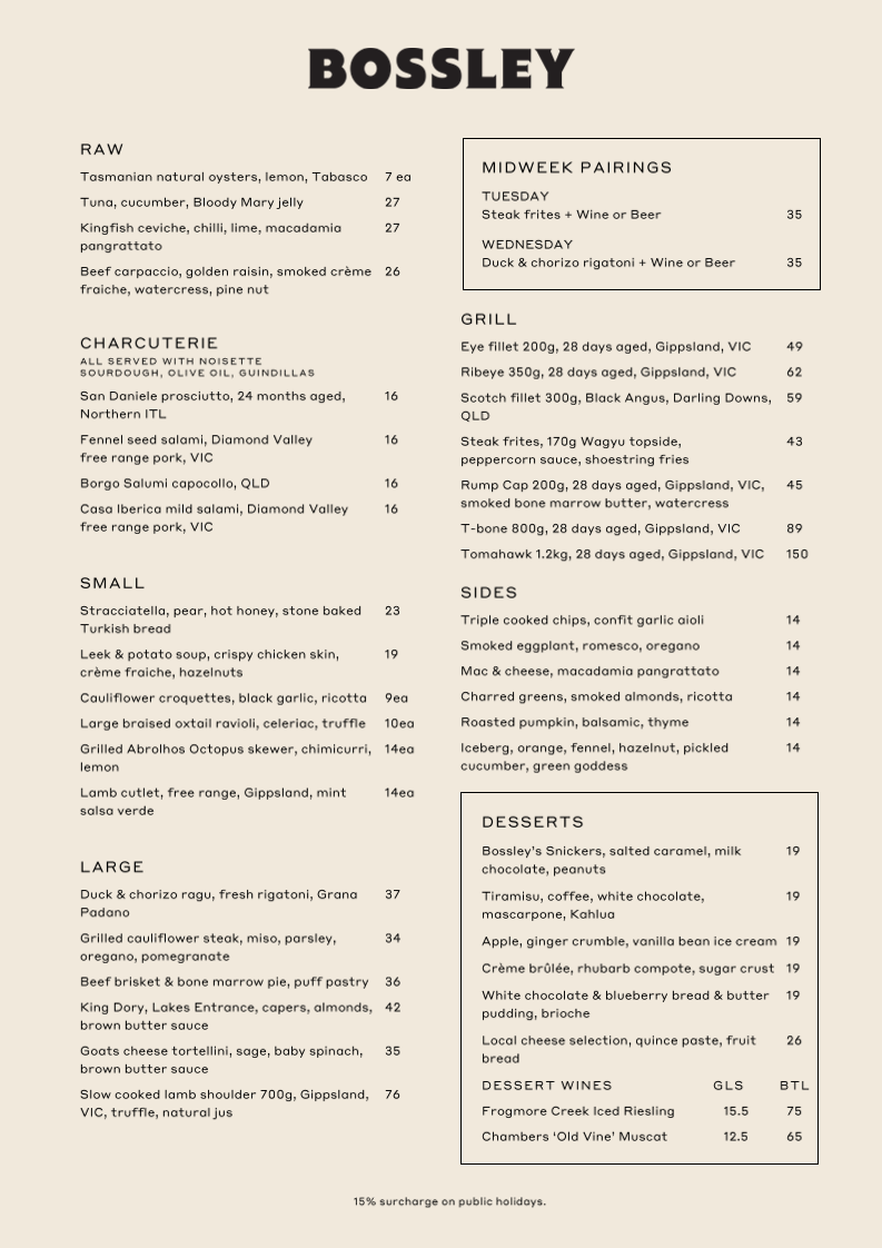 “ We are so glad that we had a chance to have dinner at Bossley’s tonight. Food was absolutely delicious, dish sizes were quite good, prices reasonable and lovely staff. My personal favourites were ‘Rump Cap 200g, 28 days aged, Gippsland, VIC, smoked bone marrow butter, watercress’ and ‘Lakes Entrance King Dory, roasted fennel, lemon, almond, brown butter sauce’. Chips were nice and crispy. Both Tiramisu and Snickers desserts are yummy. If you are after a less sweet dessert, then go with Tiramisu, otherwise Snickers is very yummy , packed with peanuts dessert. The atmosphere was great, the only thing I would prefer less music, but given this is a bar too, it’s expected, I suppose. I would highly recommend having a meal at Bossley ”